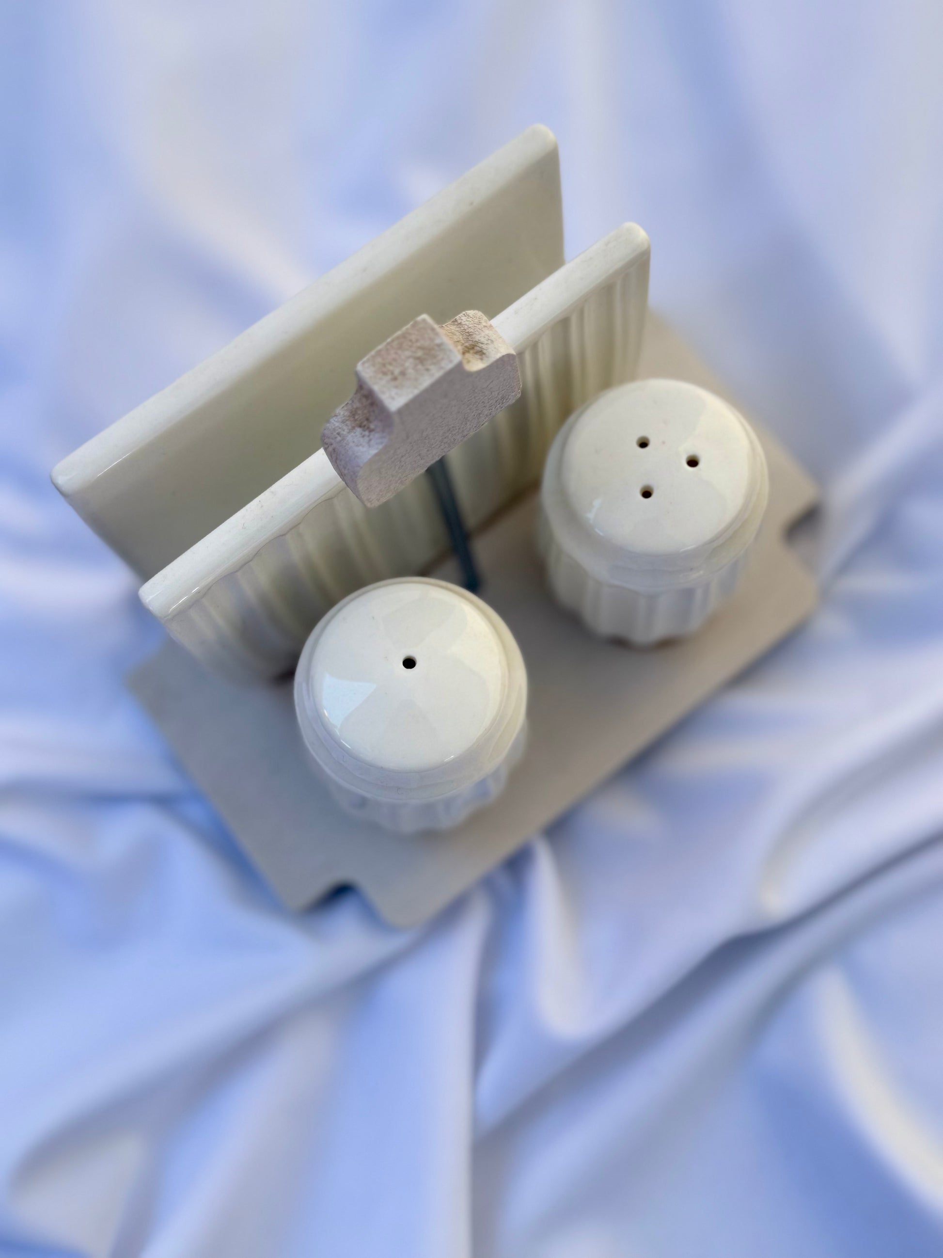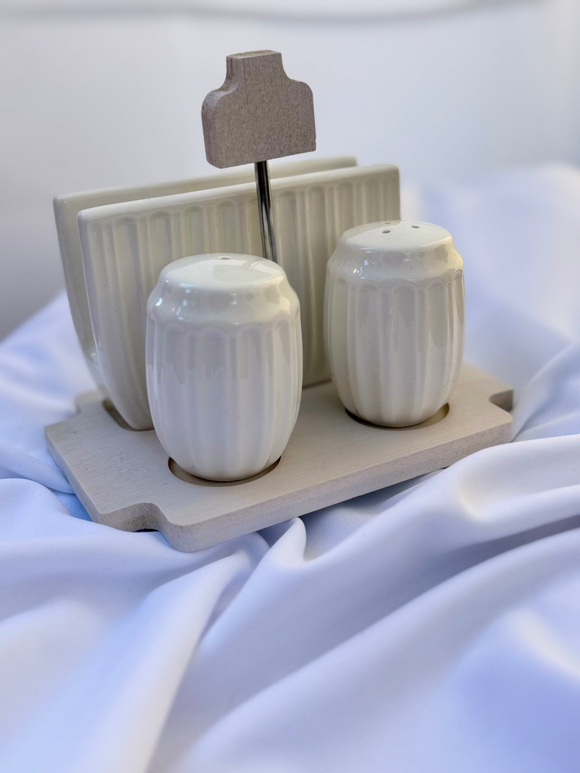 Elegante set da tavola composto da porta tovaglioli con saliera e pepiera in ceramica, dal design semplice e raffinato.