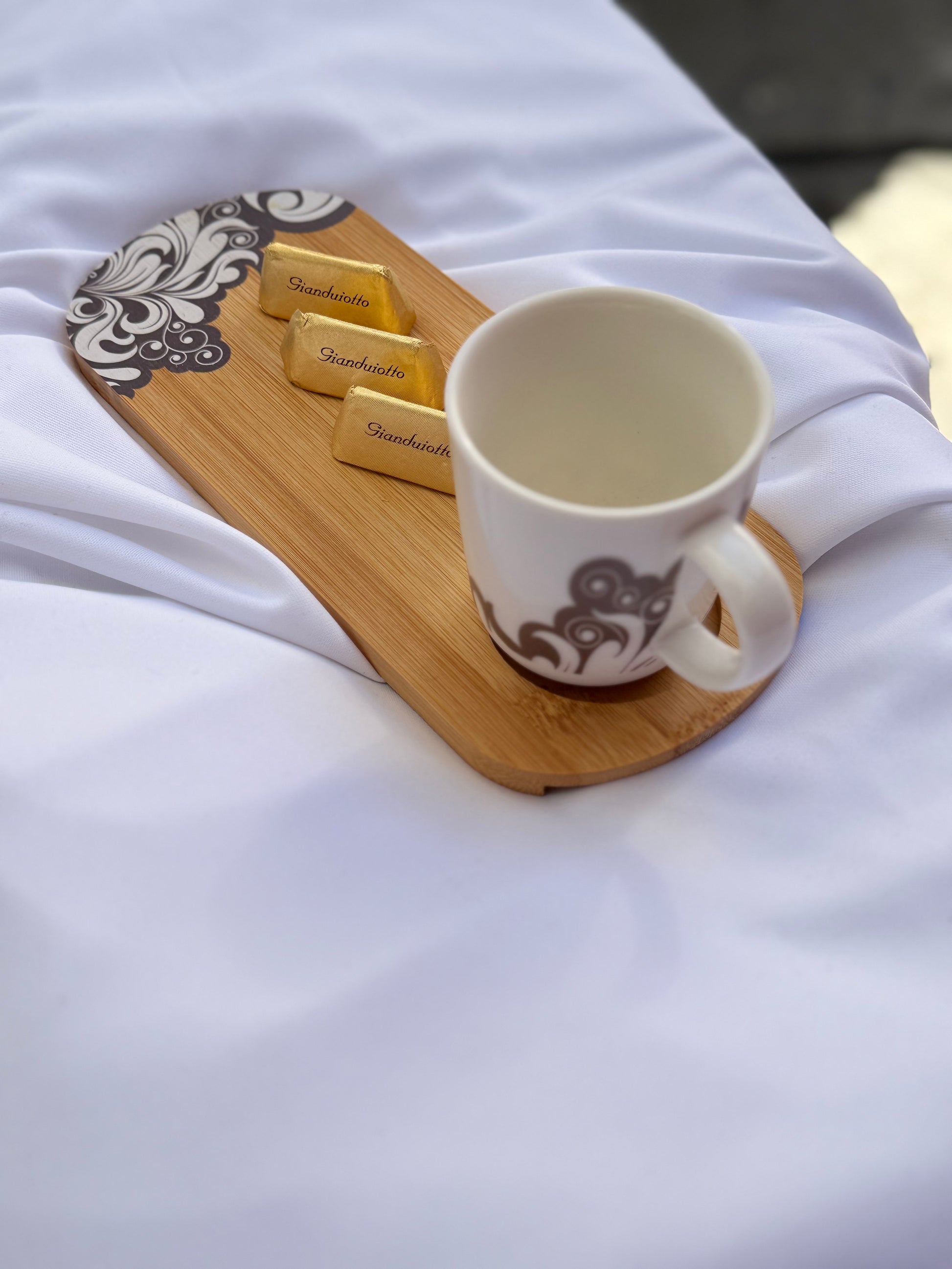 Graziosa tazzina in ceramica abbinata a vassoio in legno, pensata per servire il caffè in modo originale e raffinato.